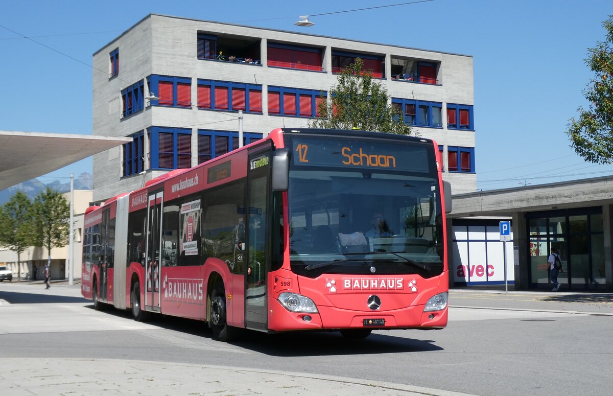 (278'655) - Aus Liechtenstein: BOS PS Anstalt, Vaduz - Nr. 598/FL 40'240 - Mercedes (ex PLA Vaduz Nr. 56/PID 11'222; ex PLA Vaduz Nr. 58) am 8. August 2025 beim Bahnhof Buchs