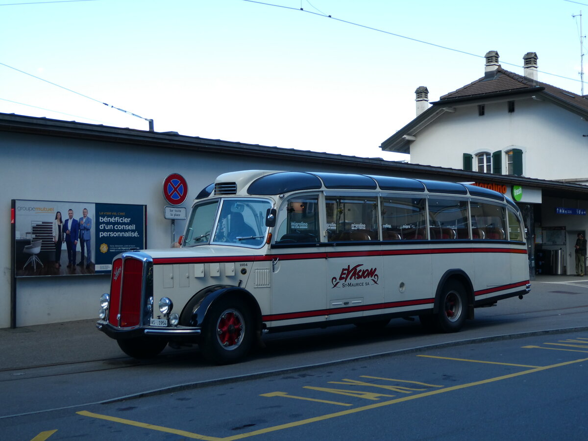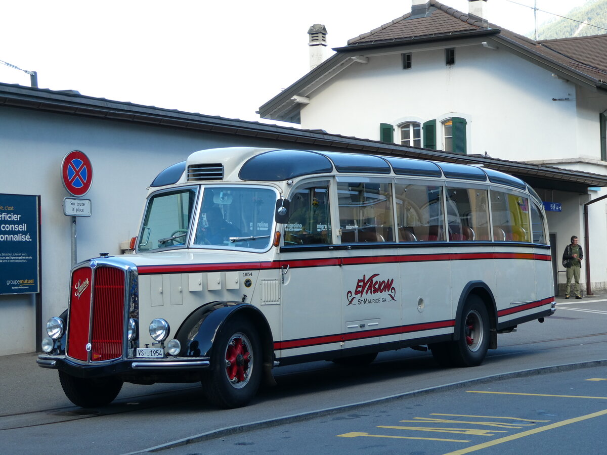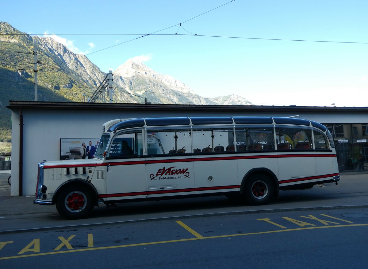 (240'593) - Evasion, St-Maurice - VS 31'954 - Saurer/Lauber (ex Zumwald, Fribourg; ex Leu, Arosa; ex Schett, Sargans; ex P 23'165; ex P 2252) am 2. Oktober 2022 beim Bahnhof Martigny