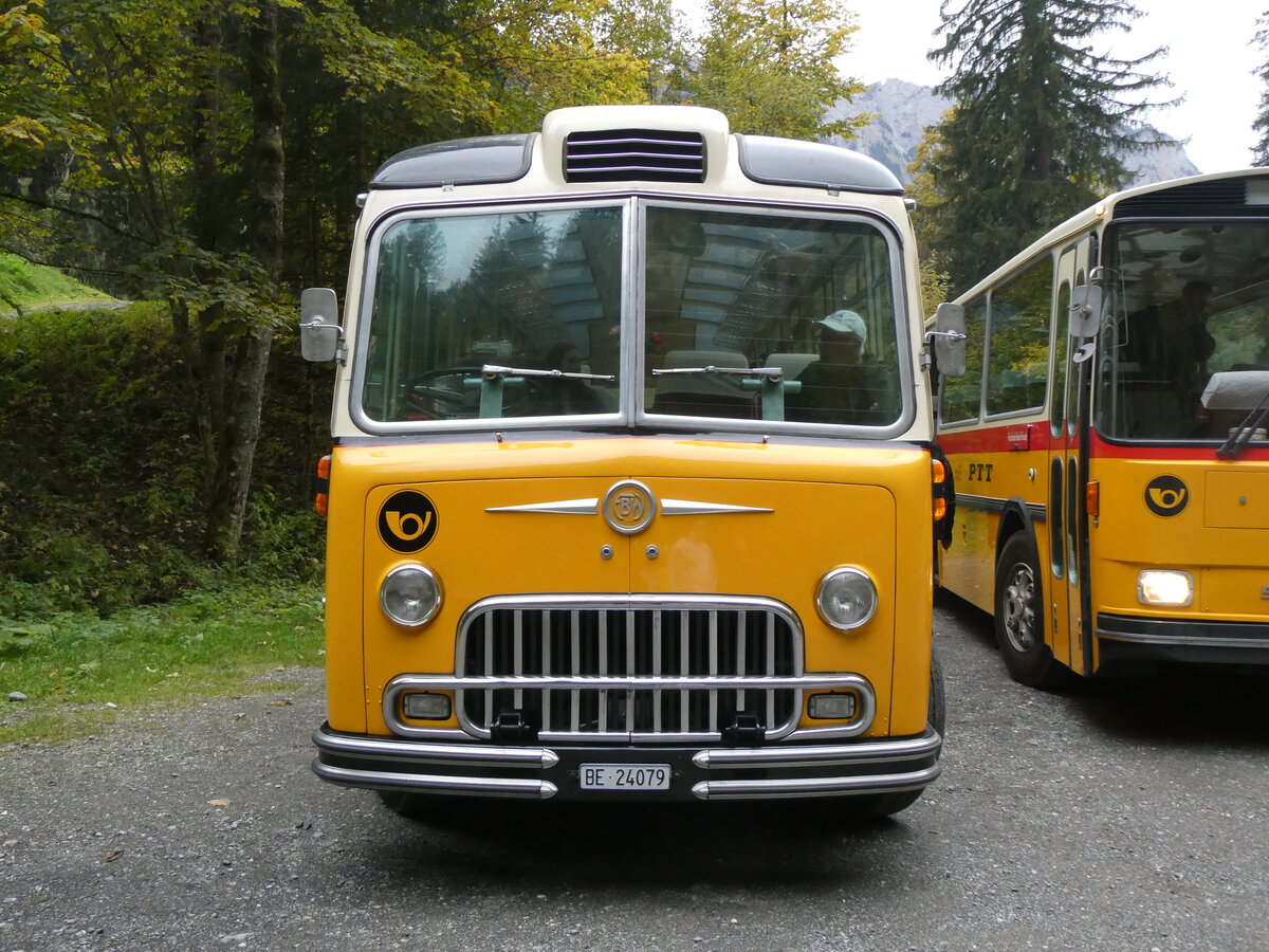 (018'800B) - Aus dem Archiv: Geiger, Adelboden - Nr. 3/BE 1585 - Saurer/Gangloff am 25. August 1997 in Kiental, Garage (25 Jahre Verkehrsverein Kiental)