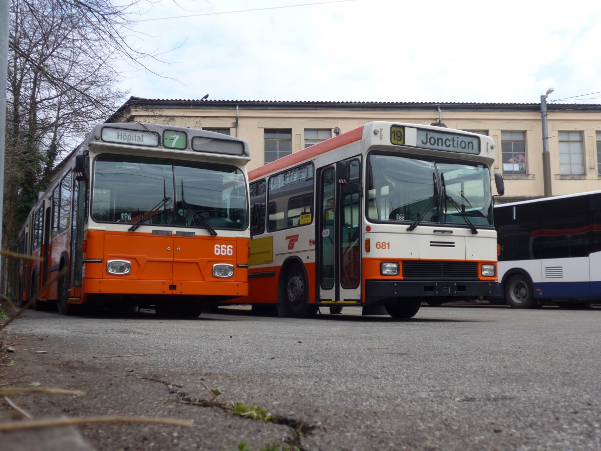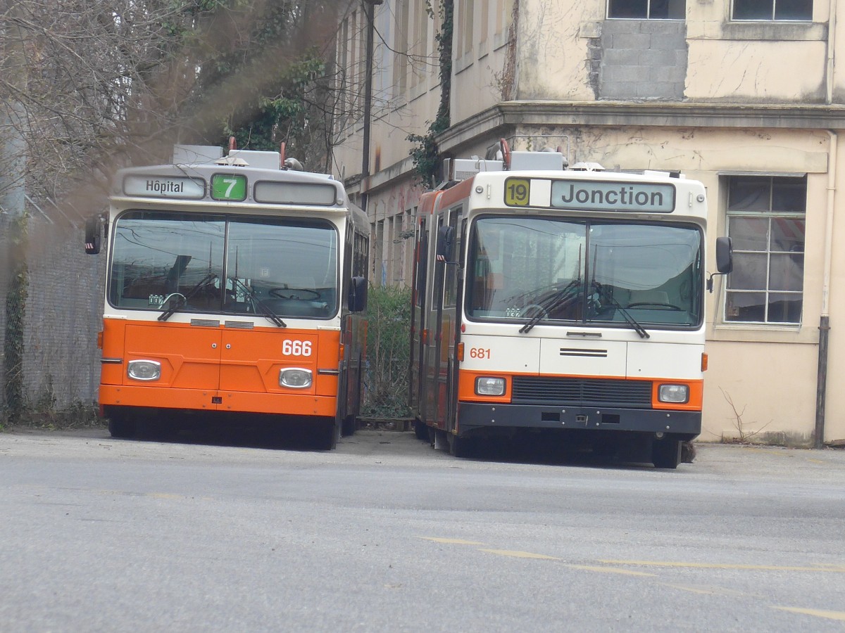 (159'113) - TPG Genève - Nr. 666 - Saurer/Hess + Nr. 681 - NAW/Hess Gelenktrolleybusse am 14. März 2015 in Genève, Dépôt Jonction