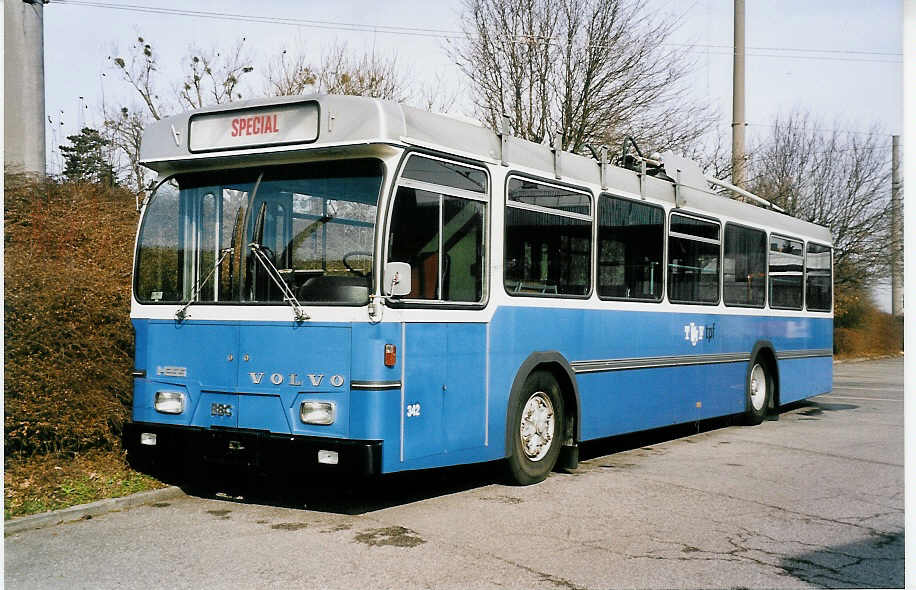 (052'030) - TPF Fribourg - Nr. 342 - Volvo/Hess Trolleybus (ex TF Fribourg Nr. 42) am 17. Februar 2002 in Fribourg, Garage
