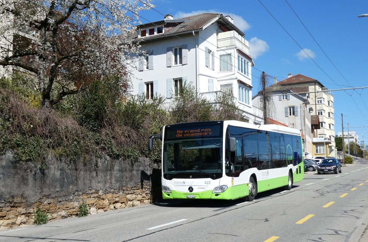 (285'951) - transN, La Chaux-de-Fonds - Nr. 423/NE 195'423 - Mercedes am 4. April 2026 beim Bahnhof Neuchâtel