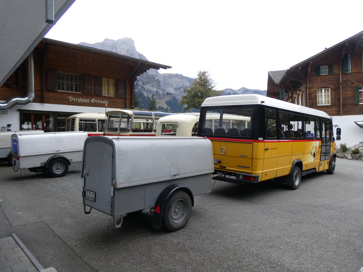 (268'167) - Schmid, Thörishaus - BE 191'868 - Moser, Gepäckanhänger (ex P 30'215) + BE 180'888 - Hess Gepäckanhänger + PostAuto Bern - BE 188'476 - Sécheron/PTT Gepäckanhänger (ex Portenier, Adelboden Nr. 1; ex Geiger, Adelboden Nr. 1; ex P 2838) + Schmid, Thörishaus BE 196'417 - Gangloff Gepäckanhänger (ex P 30'393) am 12. Oktober 2024 in Kiental, Tschingel