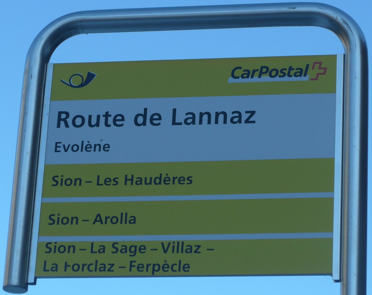 (201'755) - PostAuto-Haltestellenschild - Evolène, Route de Lannaz - am 24. Februar 2019