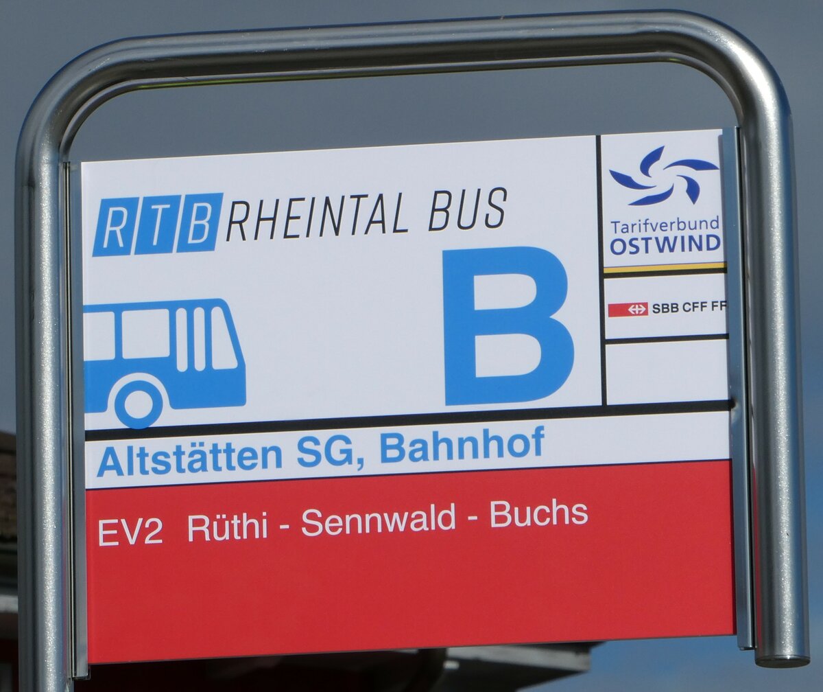 (247'047) - RTB/SBB CFF FFS-Haltestellenschild - Altstätten SG, Bahnhof - am 9. März 2023
